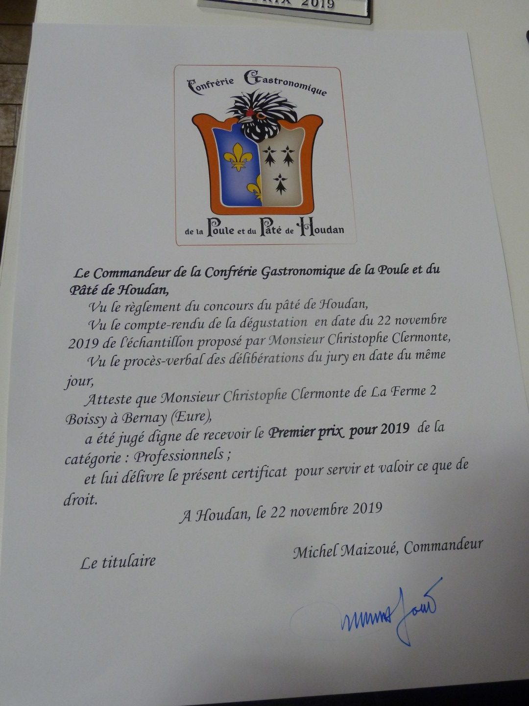 Le troisième concours du Pâté de Houdan s’est tenu le 22 novembre 2019 dans les salons du Restaurant La Poularde à Houdan, accueilli gracieusement par Sylvain Vandenameele maître des lieux.